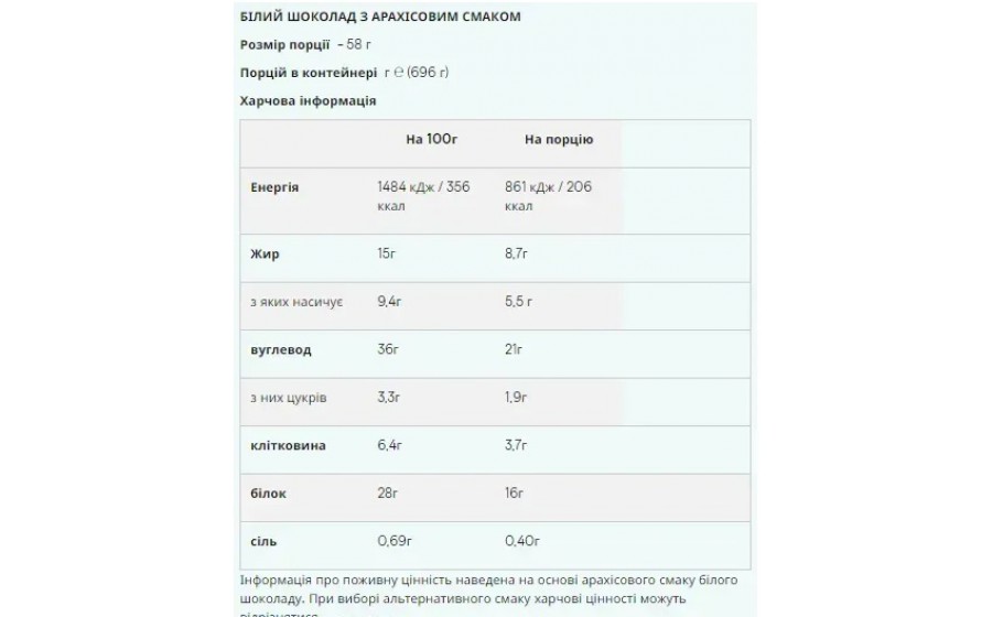 Поєднання протеїнової основи, арахісового шару, хрумких кріспі та покриття з білого шоколаду.