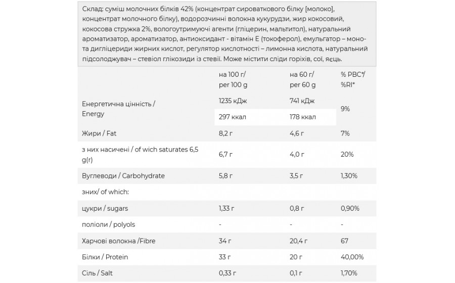 20 г - високий вміст білка — сприяє ефективному відновленню м’язів після фізичних навантажень та підтримці м’язової маси.