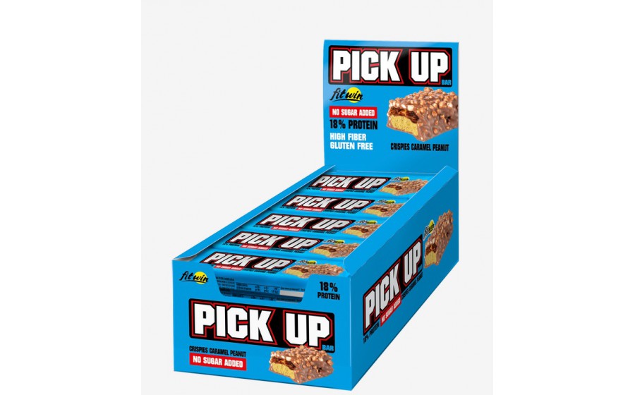 Батончик поєднує різні види горіхів, ніжну карамель або хрусткі кріспи та протеїнову прошарку з вмістом 18–20% білка. Завдяки натуральним підсолоджувачам FitWin PickUp BAR не містить доданого цукру, але зберігає приємну солодкість і м’яку текстуру.