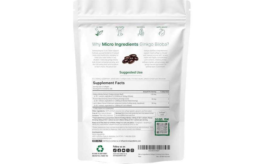 Microingridients Ginkgo Biloba Panax Ginseng Lion's Mane 5600 mg 400 softgels