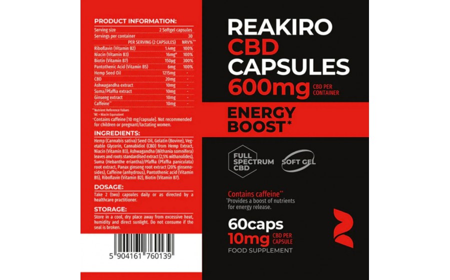 Reakiro Energy Boost CBD Capsules 600 mg (60 caps)