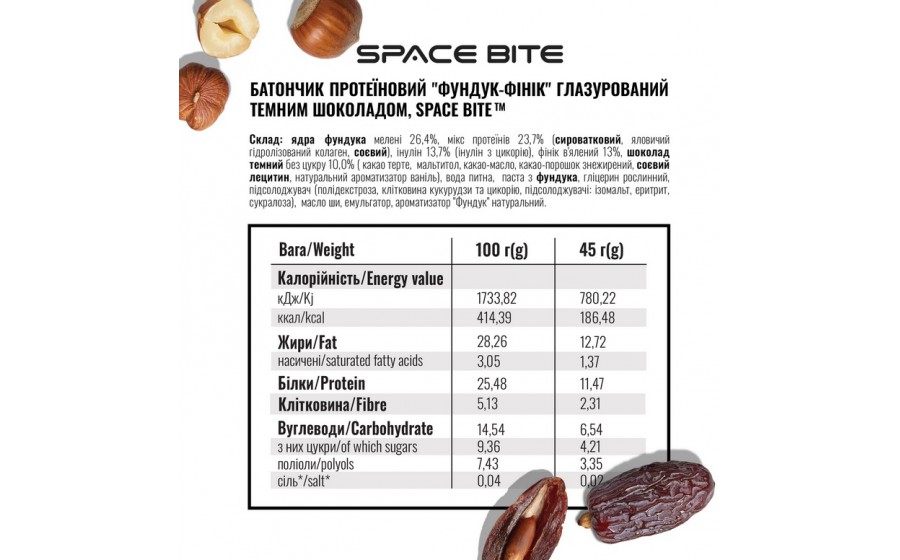 Натуральні інгредієнти: фінікова паста, фундук, мигдальне борошно, тапіокова клітковина та інші натуральні компоненти.