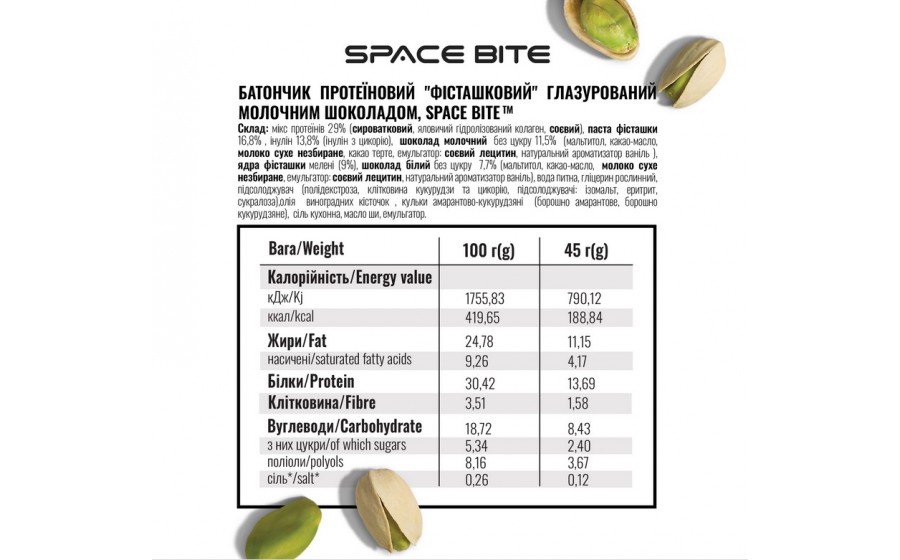 Уживайте батончик як перекус між основними прийомами їжі або після фізичних навантажень для відновлення енергії та підтримки м'язового тонусу. Зберігайте продукт при температурі не вище 20 °C та відносній вологості до 75%.