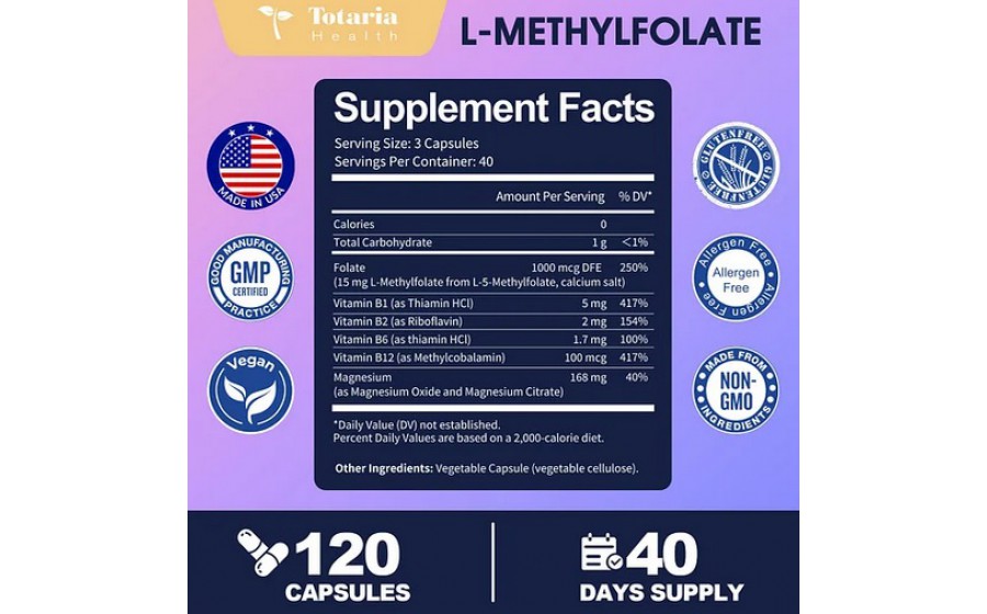 Повний опис: Totaria Health 5-MTHF Methylfolate 6-in-1 120 caps
