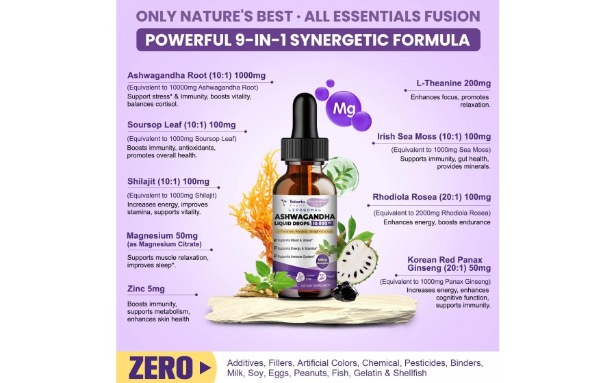 Totaria Health Liposomal Ashwagandha Liquid Drops 10000 mg 60 ml — потужна адаптогенна формула 9-в-1 для стресостійкості, енергії та імунітету