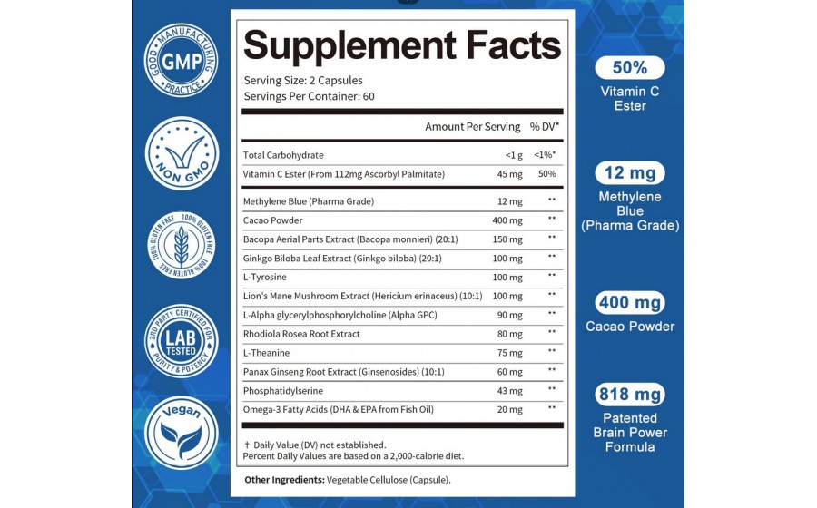 Totaria Health Methylene Blue USP Grade – це унікальна формула для мозку та клітинного захисту, яка поєднує чистий метиленовий синій USP класу з запатентованим фітокомплексом 818 мг для максимального ефекту.