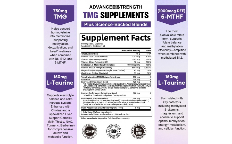 Баланс гомоцистеїну – TMG (бетаїн) у високій дозі сприяє нормалізації рівня гомоцистеїну, що критично важливо для здоров’я серця, судин, печінки та мозку.
